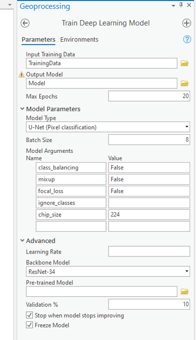 One final tip. If you have saved a model then come back later and want to continue training it, then you should choose the saved model in the Advanced\Pre-Trained Model parameter in the Training geoprocessing tool.