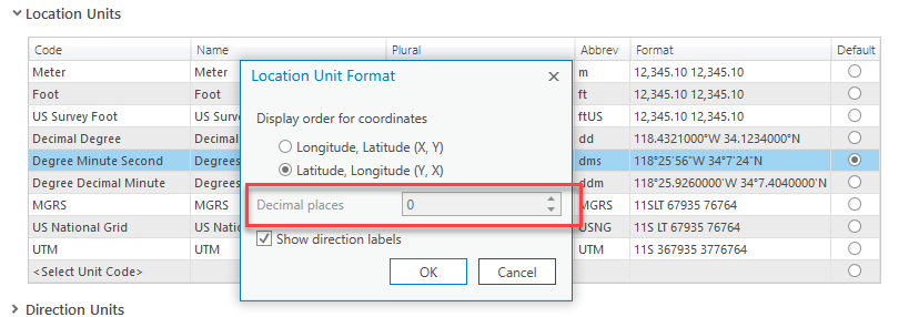 Thanks for the reply Dan. I see there is a place to set the number of decimal places for DMS, but it is grayed out. I wasn't sure if I needed to do something to activate it or if that's just the only setting for DMS.