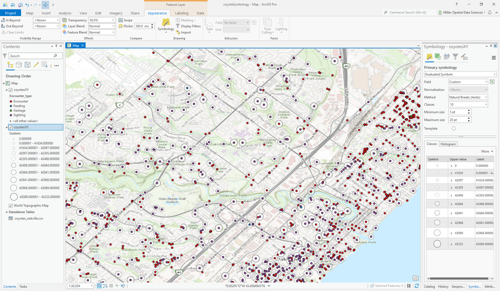 My example is here, with more than 2000 values. Color shows the encounter type; Size shows the date (recent date is larger). Modify layer sequence and transparent to show both layers correctly.
