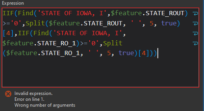 IIF(Find('STATE OF IOWA, I',$feature.STATE_ROUT)>='0',Split($feature.STATE_ROUT, ' ', 5, true)[4],IIF(Find('STATE OF IOWA, I',$feature.STATE_RO_1)>='0',Split($feature.STATE_RO_1, ' ', 5, true)[4]))