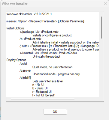 I have completed steps 1-4, but when I kick off the install, I get windows install box with some msiexec commands so I am guessing i have something incorrect in my syntax. This box just pops up, I click ok, it goes away and I'm left with a blinking cmd line again.