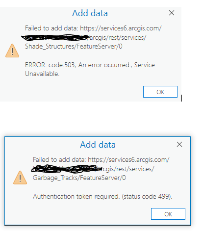 Once in a while, when I have Pro open (and logged in) and I add my own hosted feature layer from AGOL, I get this/these error(s). Any ideas why this happens intermittently?
