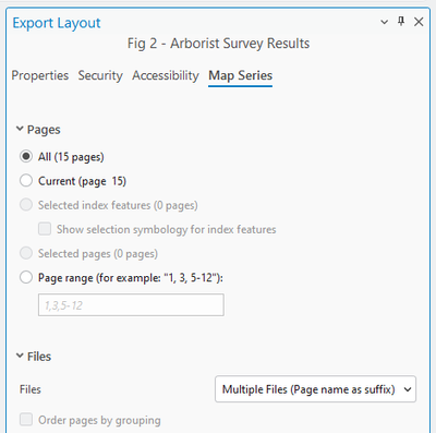 2. Today I opened the project and opened the layout. I made edits to the attributes of two features in the same layer that I had summarized the night before. Then I selected my export preset from the Export Layout item in the Share ribbon, changed the output path (which had reverted to my default folder) and then checked the Map Series tab of the Export Layout pane. It was set to one of the Multiple Pages options.