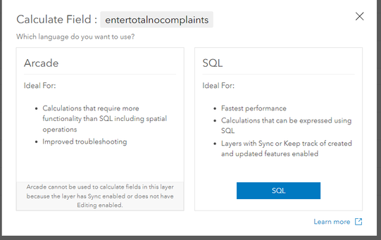 I am in the Enterprise, go to the layer, go to data, find my field "entertotalnumberofcomplaints", click calculate on that field. And based on the image below, I must use SQL. The complaint fields are string and the 'enter total complaint number' field is numeric. Does that help?