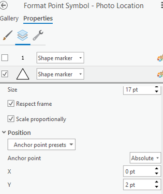 I have triangular point symbology in ArcGIS Pro 2.9.2, and they need to show a letter (based on an attribute) in the center. I tried doing a shape symbol layer with text, but it seems you can use attributes for that. So I instead am using a label to fill in the letter.