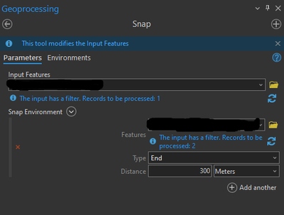 Here is my geoprocessing window for the Snap tool. 300m was the snap distance for snapping the points to the watercourse initially so I am using the same for snapping the line back to the original point. I am iterating through 1 set of points at a time so I don't need to worry about it snapping to the wrong point.