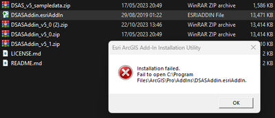 The AddIn folder has this path: "C:\Program Files\ArcGIS\Pro\AddIns\DSASAddin.esriAddIn" and I added it in the Add-In Manager in ArcGIS Pro.
