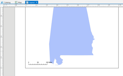 In this example I've created a scale bar that constantly shows 100 miles (2 divisions of 50 miles each). For each page, the length of the scale bar may change but the value will always be 100 miles.