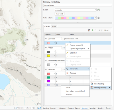 For instance, if you have a vector dataset symbolized on a field you can create headings and either right click and send a symbology value to an existing heading or drag it manually. Yet on a raster dataset you can symbolize on a value, specify headings, add values to new headings, but you can't add to existing headings or manually drag them (though the GUI suggests you can by displaying a line...it just doesn't actually work).