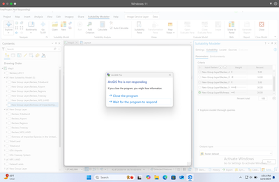 I'm trying to use the Suitability Modeler in the latest version of ArcGis. After I weigh my parameters, I go to click the layers to open the "Transformation Pane" to transform the layers before running the program and it crashes on trying to open. I've tried restarting, using different layers, etc. and nothing is working.