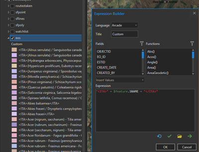 The expression builder says that the Arcade is valid but the Contents pane is not respecting the Label Expression: "<ITA>" + $feature.SNAME + "</ITA>"