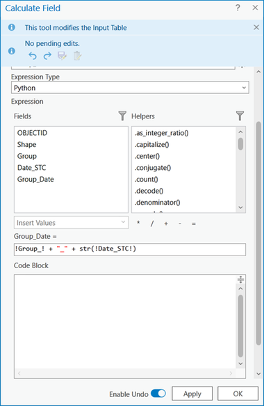 @GeeteshSingh07 @MichaelVolz As I try to join my dissolved table to the original table, I have no common field between them. I want to create a new field in each table that is a combination of the group ID (text and numbers) with the date field. How would I use the Calculate field tool to combine these two? Or, is there an easier way that I'm overlooking?