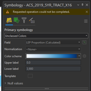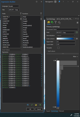 I'm trying to symbolize a layer based on a double field that has its number format set to percentage, but I keep getting an error, which also locks up the pane. Is symbolizing by a percentage field a limitation of the unclassed colors symbology method? It happens every time I try one of my percentage fields - seems to be the only common denominator. I'm just wondering if it's supposed to be this way or if I'm missing something. I suppose I could create another field, change the format, or reuse the Arcade expression that I used to calculate the field in the first place in the symbology, but I'd prefer to not do any of those things.