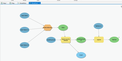 2) Next I wrote the sub-model. Instead of writing 6 selects I used a "MultiValue" iterator and used its %value% as input into my "Select Layer By Attribute" tool. The results of that tool I appended to the table I created in step one (TestCal in my case).
