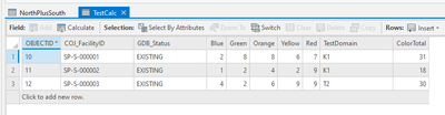 1) First thing I did was create a blank table in my database (not a feature class) that has the format I want in my output (in my case just the starting table with a field to hold the sum of the "Color" values). This is the file I'm going to append the results of the "Select by Attributes" to and the table I'm going to "Calculate Field" against. Initially its empty.... see I just added a "ColorTotal" field to the schema of the input table, but yours can be more complex.