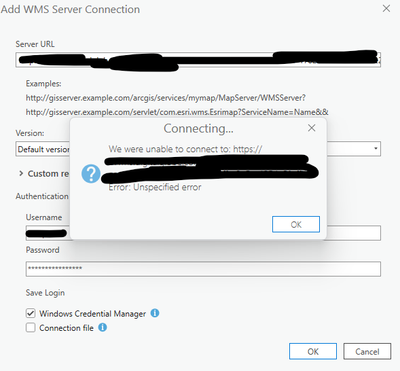 I'm getting an error trying to connect to a WMS service. I'm using Pro 3.3.1. I can successfully connect using my laptop but I get the error on my desktop. Any suggestions to fix this?