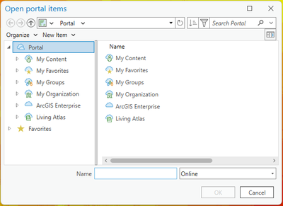 I tried to include "esri_browsePlaces_Online" in the includes property of BrowseProjectFilter (got this idea from one of the existing questions in the community https://community.esri.com/t5/arcgis-pro-sdk-questions/openitemdialog-local-only-no-portal/td-p/1311...). But still not able to make it work.