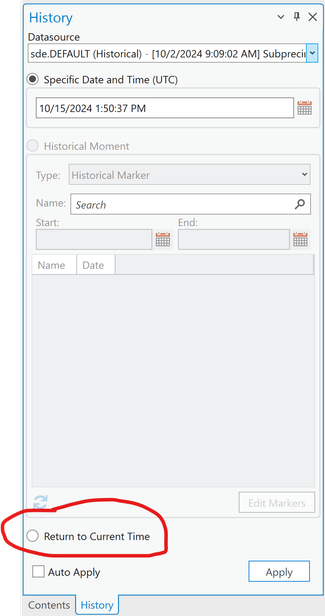 Yes I know, my issue is returning to the current moment from a historical moment, rather than switching to one in the first place. I have used the method above to connect to one. I now need to remove that and just see the default, which is the behavior achieved by the "return to current time" button in the History Dockpane.