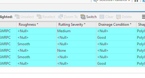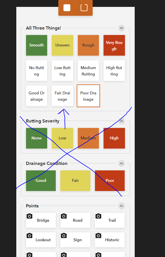 Thanks for your response. I wasn't quite clear in my initial post. The roughness, rutting, and drainage items are in a single line feature (not different layers). Based on your feedback, I modified the buttons to look like the image below.