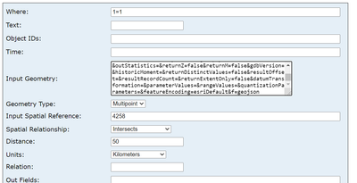 For example, I have tried to put the initial query url (with 'return geometry = yes') into the input geometry parameter for the second spatial query but this doesn't work because the result of the query is not the correct format for the input geometry parameter.