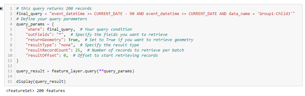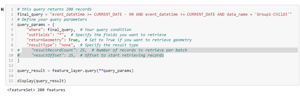 I am querying the REST API of a hosted feature layer using a Notebook within ArcPro 3.1.0. The query without any pagination returns 200 records.