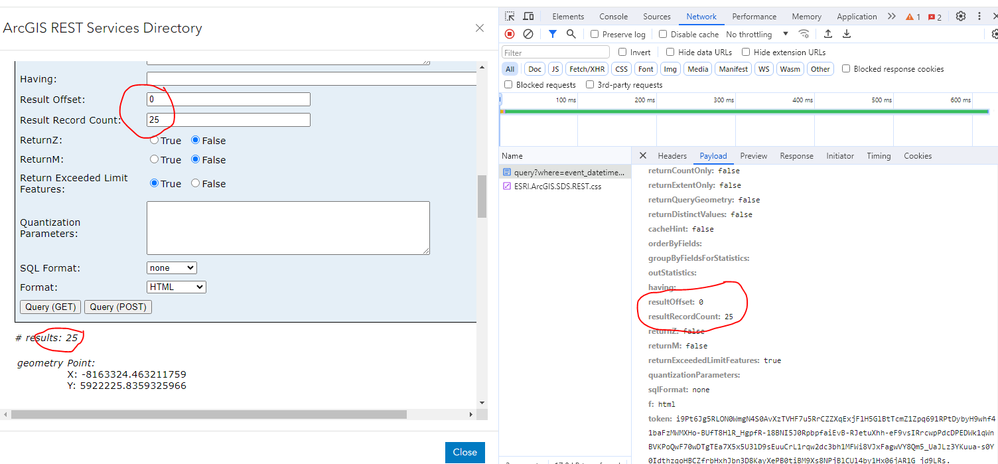 If I use the REST API web page instead and query using resultOffset of 0 and resultRecordCount of 25 it works and returns 25 records as expected.