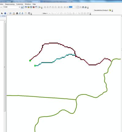 I am trying to compute shortest distance to stream from various point locations on the landscape. I am using the cost path tool in spatial analyst to do this . I am using a DEM as a cost distance raster and flow direction raster as a cost back link raster. The tool runs fine. What I see is where there are points close to each other multiple paths merge( as it is supposed to according to the algorithm).