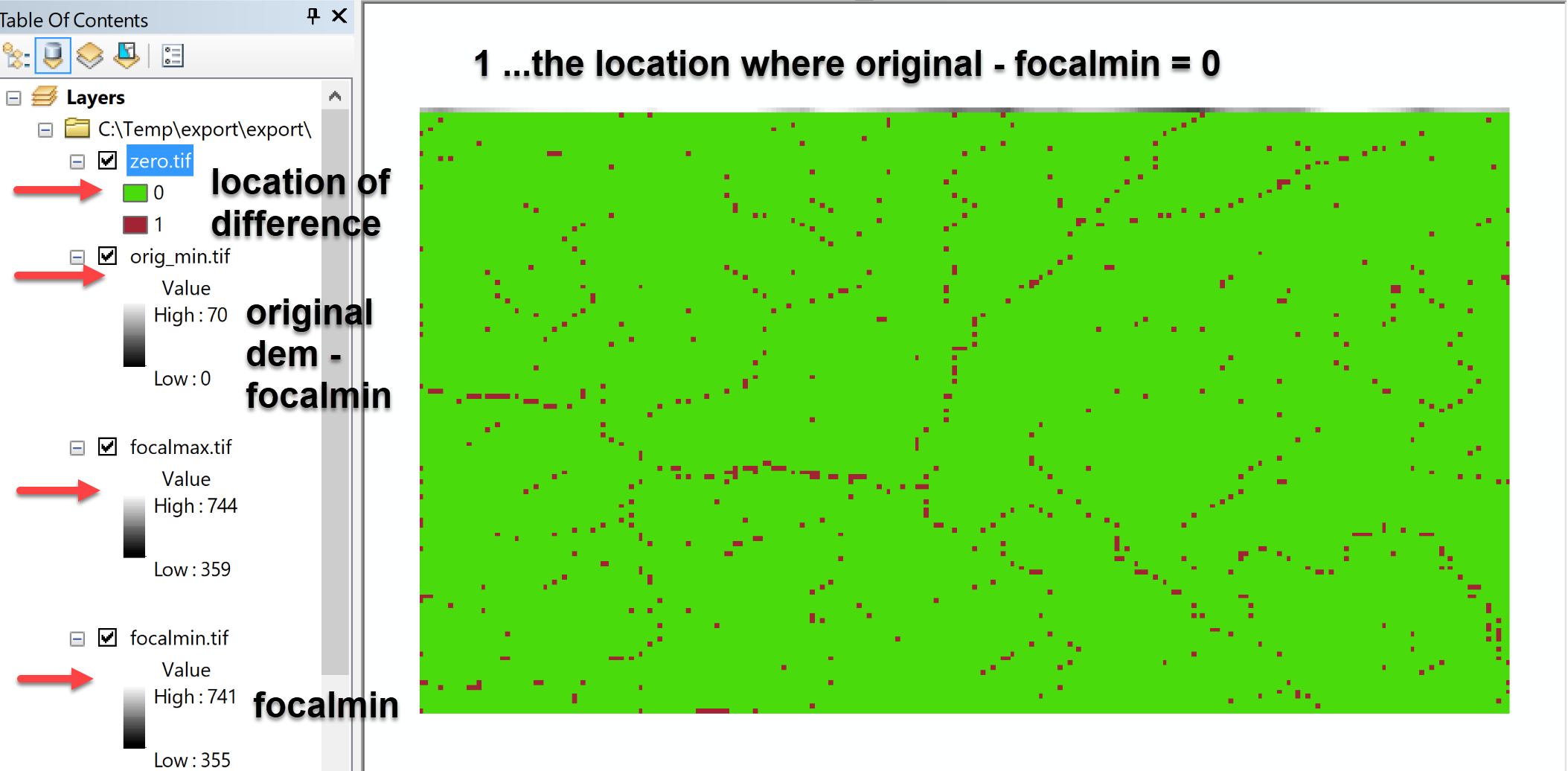 This is not what I am looking for. This is the original raster minus the Focal Min raster. As explained in one of my posts above this is not giving me what I am looking for. I am looking for the location of the min or max for each central cell. That means the number of min or max locations to be identified must be equal to the number of cells in the original raster.