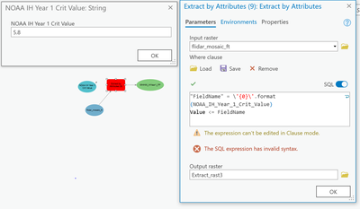 I am trying to build a model in model builder that ask for a user to define a value in a parameter (string variable) and then integrate this string variable into my raster's extract by attribute tool (spatial analyst). Basically I want a user to be able to enter say "3.2" which is related to a string variable and then utilize this string variable in the where statement of the extract by attribute tool.
