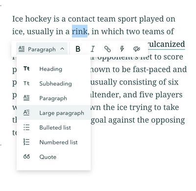 If you do want to make some text blocks larger than the others around it, you can highlight a portion of the text and choose to convert it to a Large Paragraph (as opposed to the standard Paragraph block type).