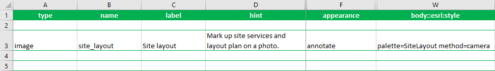 - For annotate questions, specify the image capture method in the same column, using the method parameter. The palette and method parameters must be separated by a space. For example, palette=SiteLayout method=map,camera,browse. For more on the method parameter, see the documentation on appearances.