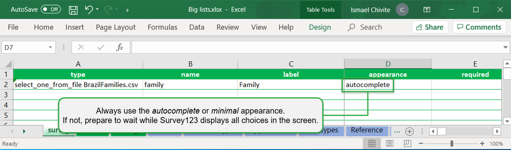 The performance boost is also noticeable when you work with big lists in the Survey123 field app. Nobody likes to wait for a form to open! Specifically, the very first time a survey is loaded into the Survey123 field app, indexes are built to optimize the form. Indexes on very large lists can be built much more quickly from a CSV file than from the choices worksheet. Indexes are only built once, when the form is opened for the first time on the device, but the time difference is substantial.