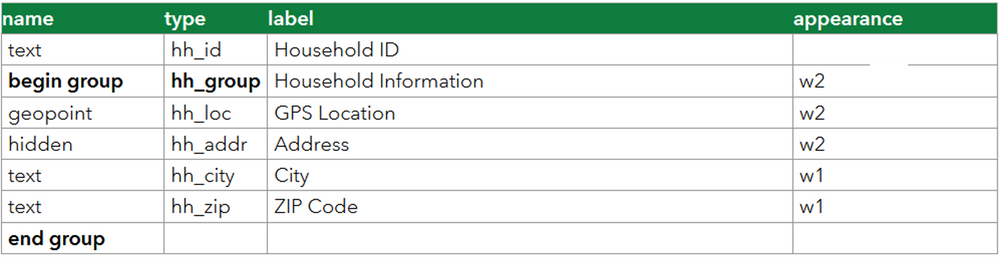 Once the grid style is set, all groups within your survey will contain questions using a four-column grid layout. You can change the number of columns in a grid by simply adding the w (as in width) property to the appearance column of your group. For example, w2 means two columns, w8 means eight columns.