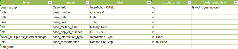 In the example below, the grid style for the Case_Info group is overwritten using the body::esri:style column.