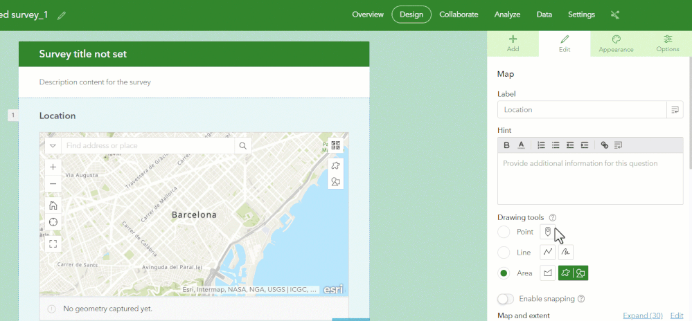 Can the Survey123 map question be configured to collect lines or polygons? Yes, as shown in the animation below, the web designer lets you decide what type of drawing tools you want to make available to respondents.