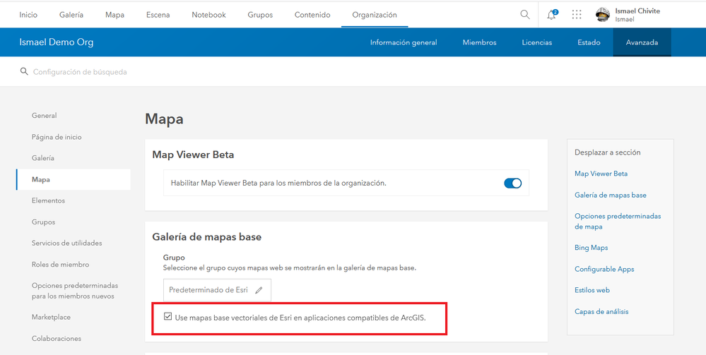 Te adjunto foto de lo que me aparece en la consola de administración. Por alguna razón o veo la opción "Use mapas base vectoriales" para seleccionarla, lo más parecido que veo es compartir mapas base vectoriales. Me podrías indicar si estoy pagina correcta o que tendría que hacer para habilitar la opción.