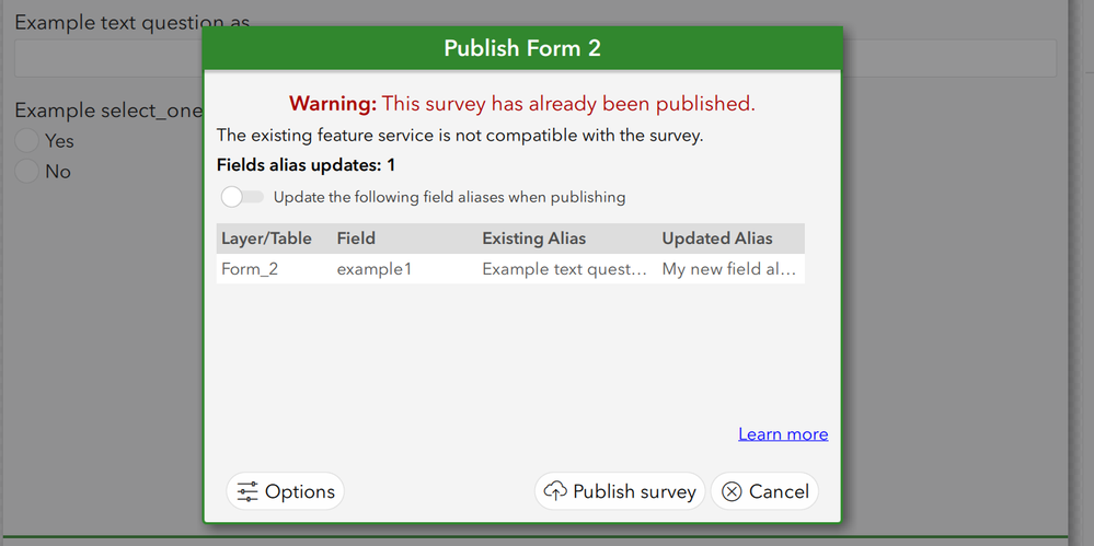 • ENH-000152036: Provide the capability for changing a question's Label in Survey123 Connect XLS form to update the field alias/Display Name in associated feature layer's attribute table