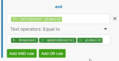 I then had to add an AND statement to my filters to have the globalID coming out of the Iterator match the glabalID in the Response -> updateResults.