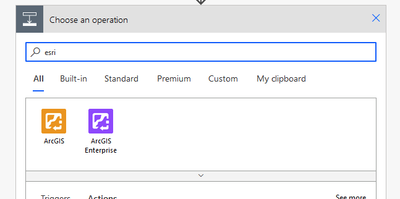TIP: When working with Esri's connectors in Power Automate, first search for "Esri" > select your workspace (i.e., AGO or Enterprise) > then locate your desired action