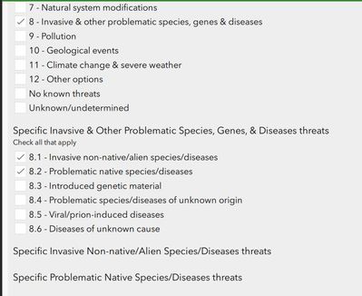 select_multiple threat_invasive2threat_invasive81Specific Invasive Non-native/Alien Species/Diseases threats(selected(${threat_cat_gen},'32') and selected(${threat_invasive},'33'))filter=${threat_invasive}