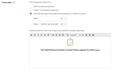 I've made a survey on Connect, that is now closed to the public. When I click on the link, the survey doesn't show up, but the closed message also doesn't show up. Which is a problem, since the message provides a link to the new year's survey. Any idea on how I can resolve this?