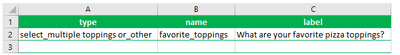 For multiple choice questions, surveys often include the option to choose other when an answer choice is not listed. Then the respondent is usually asked to specify the other option. You can do this in XLSForm by including or_other after the answer choice list name in the survey worksheet. The choices worksheet remains the same. See the following: