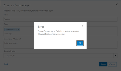 Hello @ekangeles ! Like @wizgis said, try to create a Hosted Service from Content > New Item (Image 1) if you get the same or a similar error, probably the next steps can help you. (at least was the only solution that Work for me)