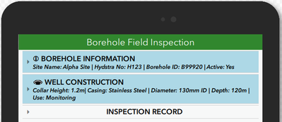 Since inspectors might not always need to see / edit the borehole information I decided to put it in it's own group and collapse the group by default. I had a brainwave though to display the details inside the group as part of the group header! This gives the inspector the advantage of seeing the information inside the group in a compact format without necessarily opening up the group.
