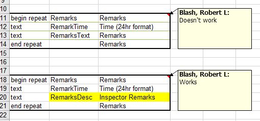 Then the field within the repeat; I had to remove this question from the repeat in order for the custom report to be uploaded. This custom report worked well prior to this release.