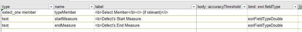 Hi! The bind::esriFieldType column is used to define the type of field that will be created in the feature layer of your form once it is published from Survey123 Connect. This is an optional (an advanced) column that is typically used when you want to overwrite the default field types mappings chosen by Survey123 Connect. There is more info about this in https://community.esri.com/groups/survey123/blog/2015/08/24/xlsform-mappings-to-arcgis-feature-servi...