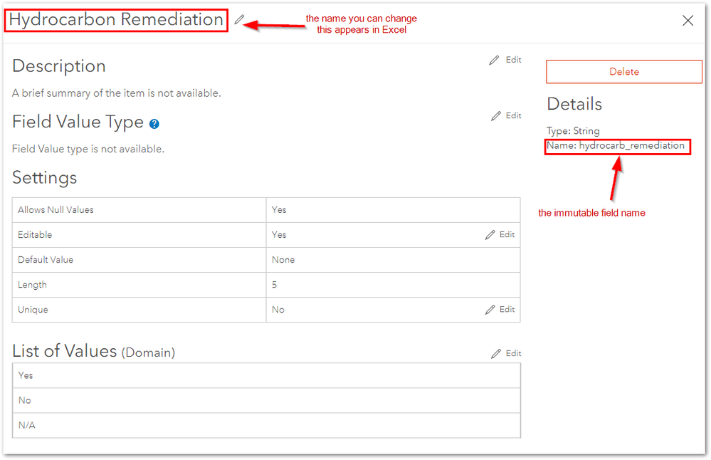 Find the feature layer that your survey uses > Data tab > Fields tab