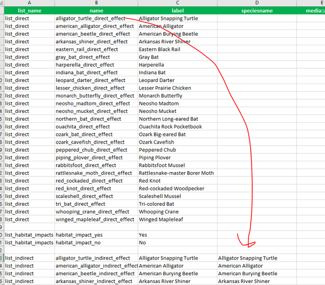 Your speciesname column needs to match the value from the name column not the label column. The name value is what is stored in the data, label is just the user friendly display.