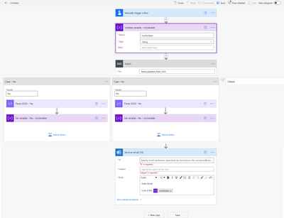 If you go with the branched approach, you may end up having two separate emails. In that case, it is likely straight forward what to do. However, even when I use a branched approach to a flow, I tend to share as many of the common elements as possible to avoid making extra work for myself. In many cases, that means I share the final email. If that ends up being the case for you, I'd suggest you use "Initialize Variable" to set a text variable. You can then "Set Variable" with each of the branches, and then call upon that variable outside the branches. Here is a quick example that may help illustrate what I mean: