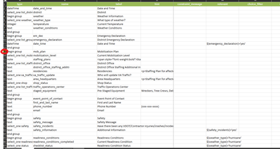 Then create a new group and add the questions into it, starting from the weather group or mobilitization plan to the last question - including the weathered group or mobilitization plan. Also associate new group questions with ${district} != “demobilized” relevant